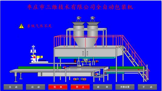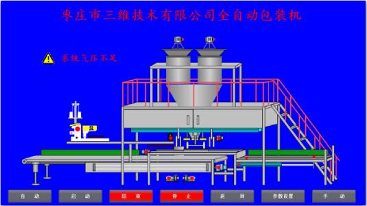 如出現(xiàn)圖中報警信息時,在處理完報警內(nèi)容并且沒有報警信息后,點擊“自動”按鈕,或外部旋鈕選擇,此時“自動”按鈕顯示為亮綠色,提示切換完成,按儀表啟動按鈕,啟動稱料系統(tǒng),點擊屏幕或外部“啟動”按鈕,設(shè)備啟動時首先經(jīng)過6秒左右的初始化,報警燈伴隨聲光報警,提示相關(guān)人員設(shè)備啟動,套袋擺臂執(zhí)行一個抬起落下動作,以回到準(zhǔn)備位置,抱袋小車如不在準(zhǔn)備位置則回到準(zhǔn)備位置。初始化完成后,屏幕上啟動按鈕亮起,設(shè)備進(jìn)入正常工作狀態(tài)。
